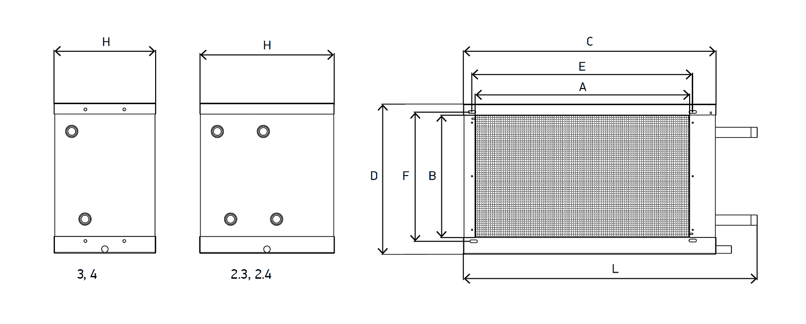 | Модификация оборудования | Типоразмер | Рядность теплообменника: 3 — 3 ряда; 4 — 4 ряда; 2.3 — 6 рядов; 2.4 — 8 рядов. |