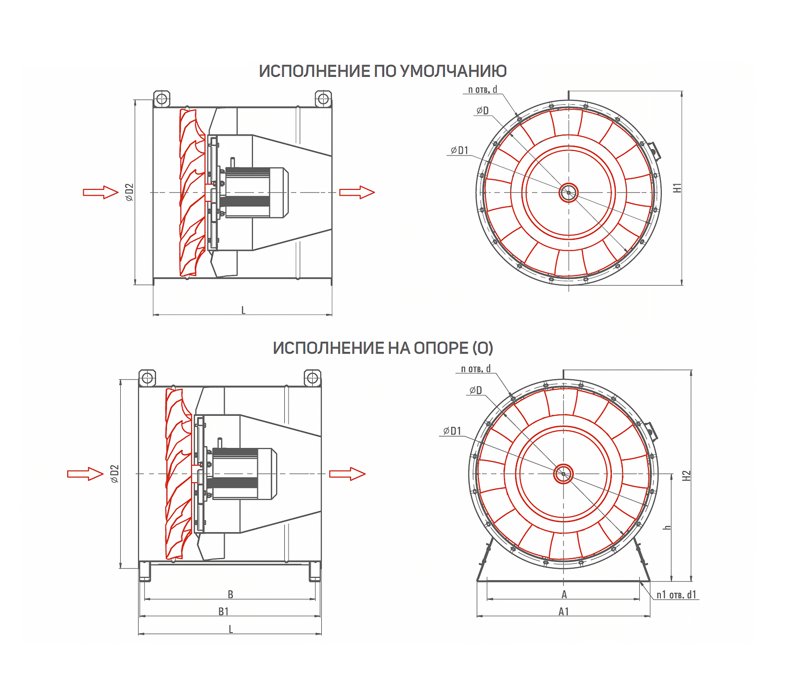 | Тип вентилятора | A | A1 | B | B1 | D | D1 | D2 | d | d1 | H1 | H2 | h | L | n | n1 |