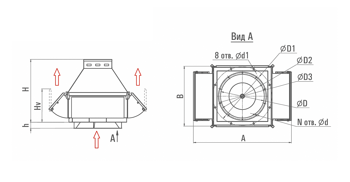 | Тип вентилятора | A | B | D | D1 | D2 | D3 | d | d1 | H | h | N |